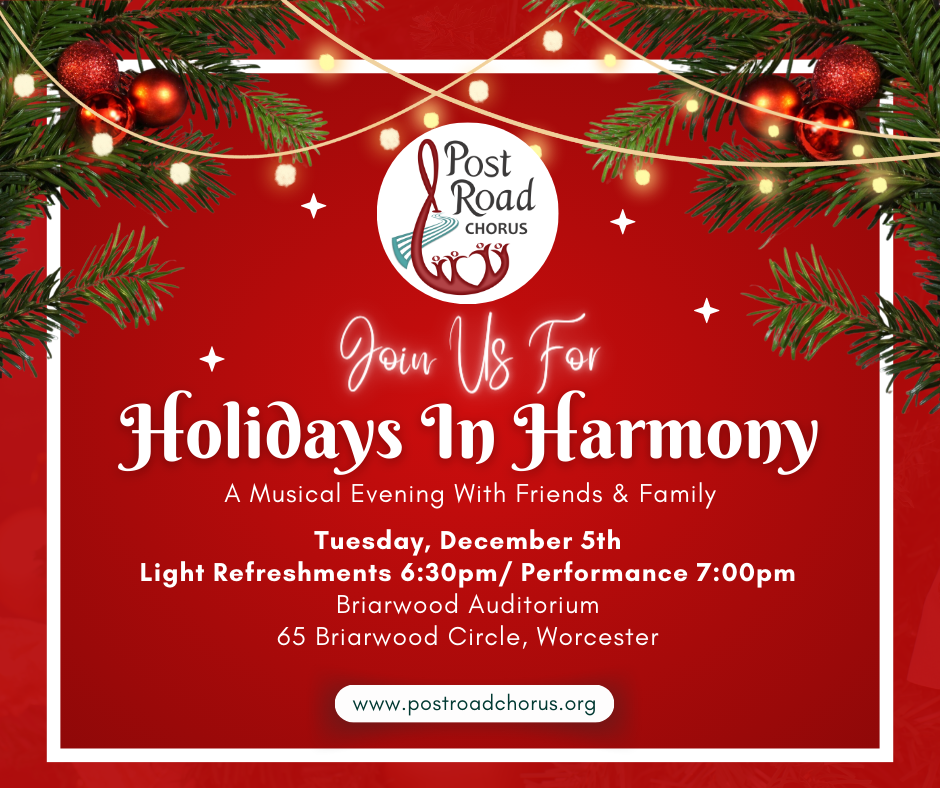 Holiday Performance December 5th STAGING Post Road Chorus Posted on November 29, 2023 by Karen DiVerdiJanuary 19, 2024 Join us Tuesday, December 5th for our Annual Holiday Performance for Friends & Family! New voices are always welcome!